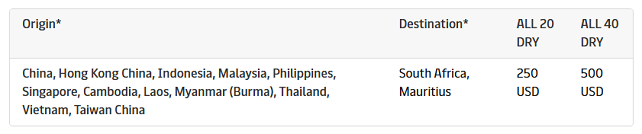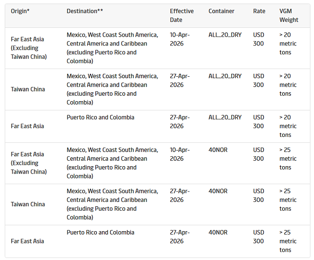 远东亚洲始发,去往南美西海岸、中美洲、墨西哥及加勒比地区(不含波多黎各、哥伦比亚),全箱型统一收费250美元,2026年3月31日生效;