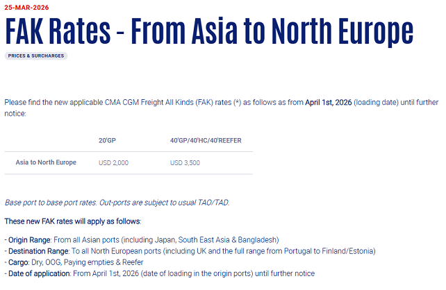 自2026年4月1日装货日期起生效,直至另行通知,所有亚洲港口(含日本、东南亚及孟加拉国)至所有北欧港口(含英国,以及葡萄牙至芬兰、爱沙尼亚全线港口)各类货物统一运价(FAK)如下: