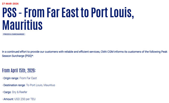 调整旺季附加费(PSS),适用范围为中国、中国香港、印度尼西亚、马来西亚、菲律宾、新加坡、柬埔寨、老挝、缅甸、泰国、中国台湾及越南发往南非与毛里求斯航线。自2026年4月6日起生效,执行至另行通知为止。
