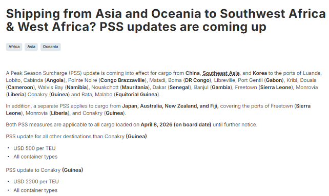 实施新一轮旺季附加费(PSS)调整,适用于2026年4月8日装船(提单装船日期)及之后的所有货物,直至另行通知为止。